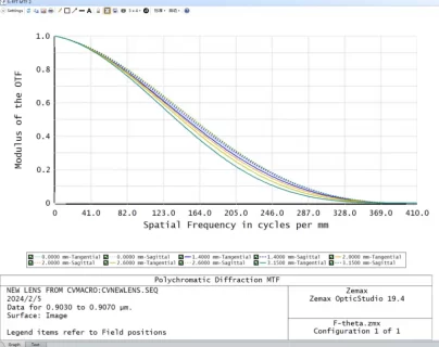 The critical focus of the F-theta lens is the accurate convergence of the spot size on the image surface. Spot quality assessment employs the Modulation Transfer Function (MTF), aligning with established measurement techniques. Challenges in evaluating spot quality arise due to the designed wavelength potentially exceeding the existing equipment’s test range, limited to a maximum of 950nm. To address this, a compensatory measure involves post-focusing, ensuring compatibility with testing needs.