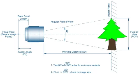 - Magnification (m): The ratio between sensor size and FOV, defining the lens magnification required to capture a specific field of view.