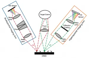 Shanghai Optics makes custom Dual Amici Prisms for scientific research applications. The figure shows the configuration of a spectral image fusion system with Dual Amici Prism. In order to generate a high-spatial and high-spectral images, researcher designed a system with two imaging arms, i.e., multispectral imaging arm and hyperspectral imaging arm. With the use of custom dual amici prism, researchers successfully demonstrated their scientific research works through real experiments within the visible spectral range
