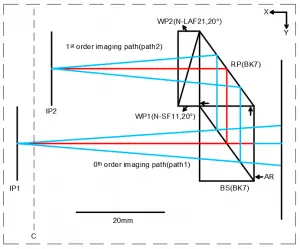 Shanghai Optics makes custom Dual Wedge for microscopy applications. The figure below shows the dual wedge prism (DWP) unit used in a 3D spectroscopic single-molecule localization microscopy (sSMLM) system. The DWP unit consists of a pair of wedge prisms, which include one with strong chromatic dispersion (WP1, N-SF11 glass, refractive index n = 1.791 at 550 nm) and another one with weak chromatic dispersion (WP2, N-LAF21 glass, refractive index n = 1.792 at 550 nm). With the use of customized dual wedge prisms, researchers successfully demonstrated a compact 3D sSMLM module with the monolithic imaging spectrometer that can readily transform a conventional optical microscope into an sSMLM.
