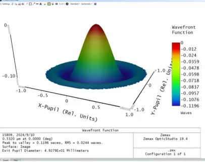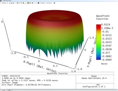 The expander is equipped with four lenses in a Galilean arrangement, chosen to prevent laser convergence within the lenses and maintain an undisturbed wavefront. This configuration is particularly well-suited for high-energy laser applications. Given that this expander is a focal-free system, its performance is typically evaluated using interferometry. For this specific design, the transmitted wavefront deviation (PV) for both the 532nm and 1064nm wavelengths is maintained below 0.25λ.
