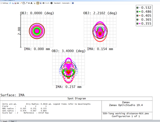Performance evaluation centers on dispersion spot radius and modulation transfer function (MTF) analysis. For this model:- RMS dispersion spot radius:
