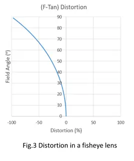 As with other aberrations, a lens with a larger field of view will generally exhibit a larger amount of distortion. A fisheye lens or ultra wide-angle lens produces strong visual distortion. Figure 3 shows the distortion in a fisheye lens with effective focal length of 3.0mm. Figure 4 shows a simulated image of a wide angle lens with -50% distortion.