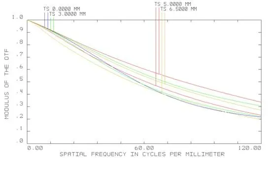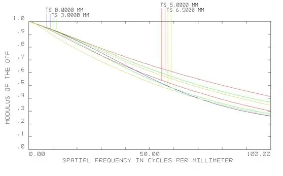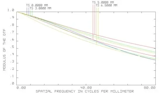 As shown in the above MTF curves, MTF is greater than 0.2 for field of view at 120lp/mm; MTF is greater than 0.25 at 100lp/mm and MTF is greater than 0.3 at 80lp/mm. Compare to other SWIR Lens, the spatial resolution of our lens is very good and can obtain ideal imaging quality when using in the spectrometer.