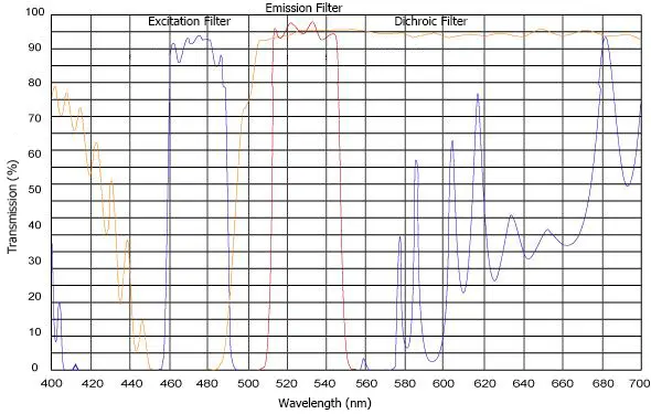 Each fluorescence filter cube features three distinct optical filters: an excitation filter a dichroic mirror and an emission filter.